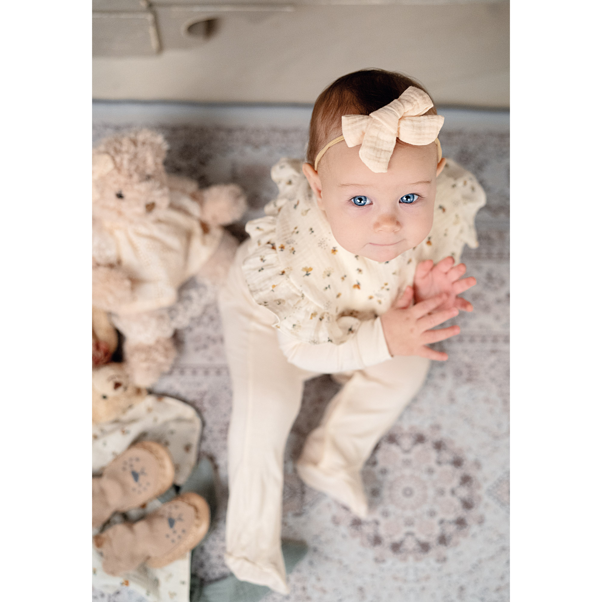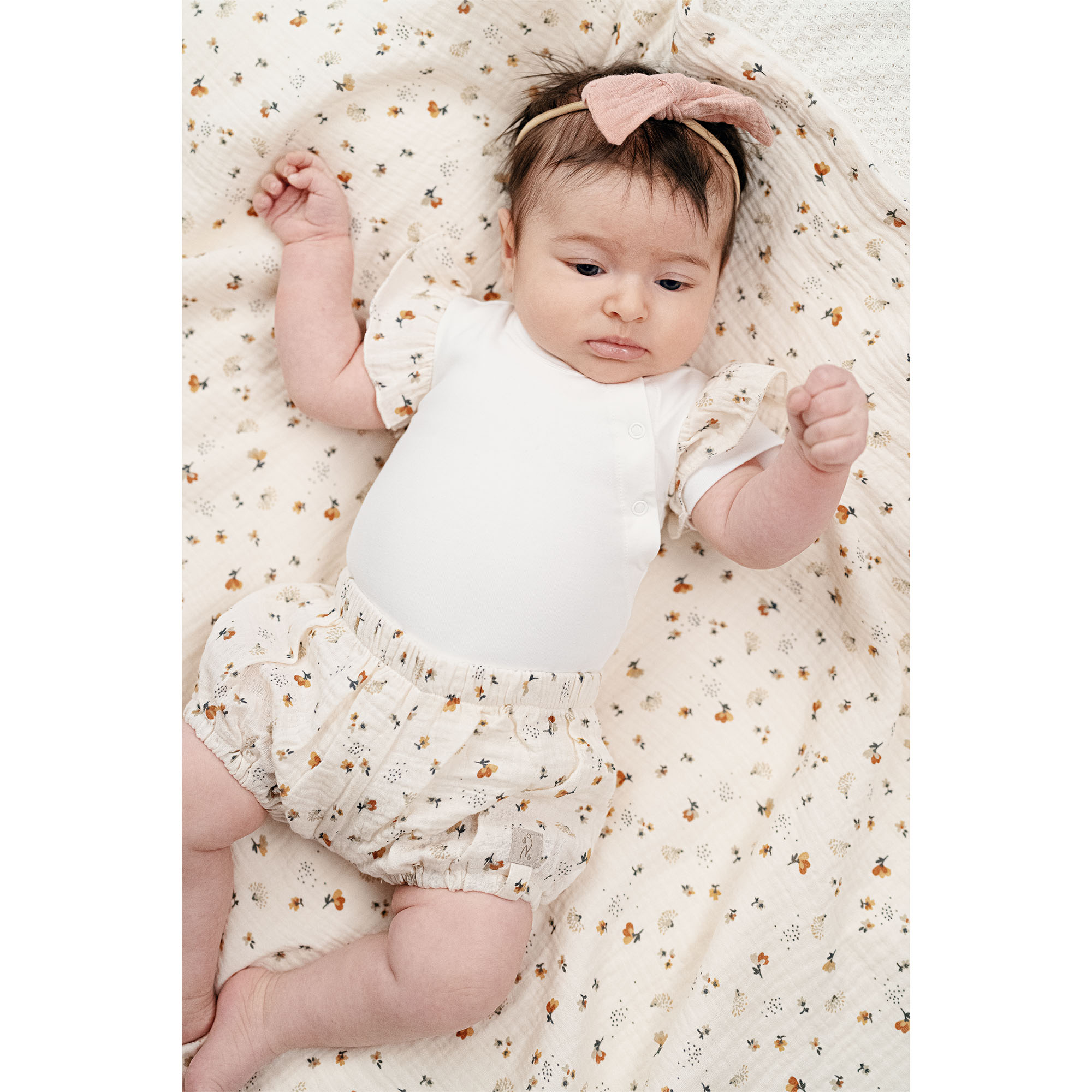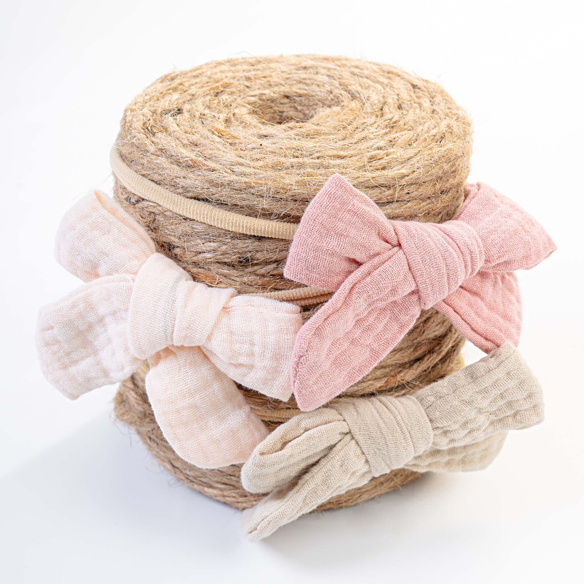 Lassen Sie sich von der Süße des elastischen Haarbandes mit Schleife aus Baumwollmusselin überzeugen. Erhältlich in 3 Farben: flamingo, puderrosa, seil.