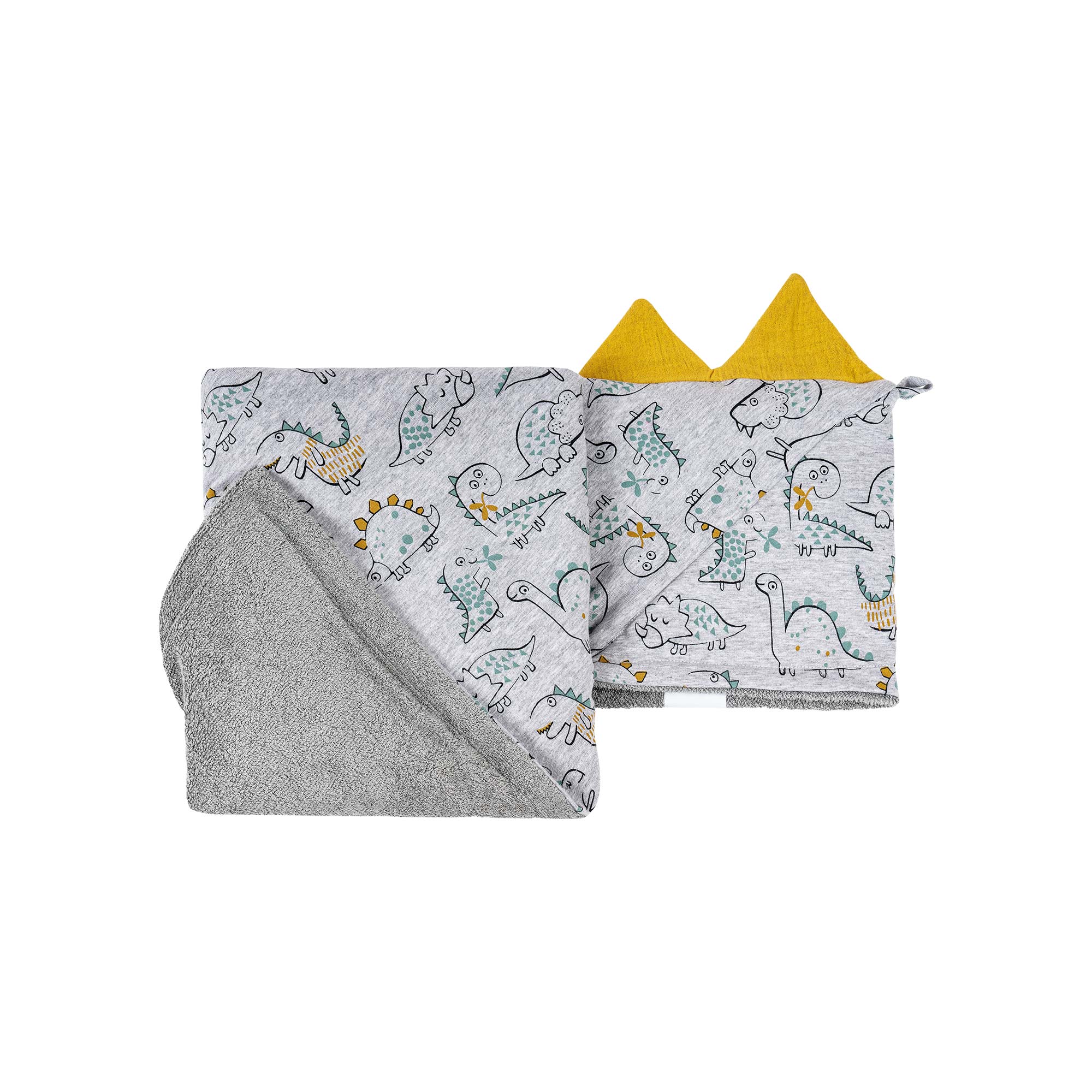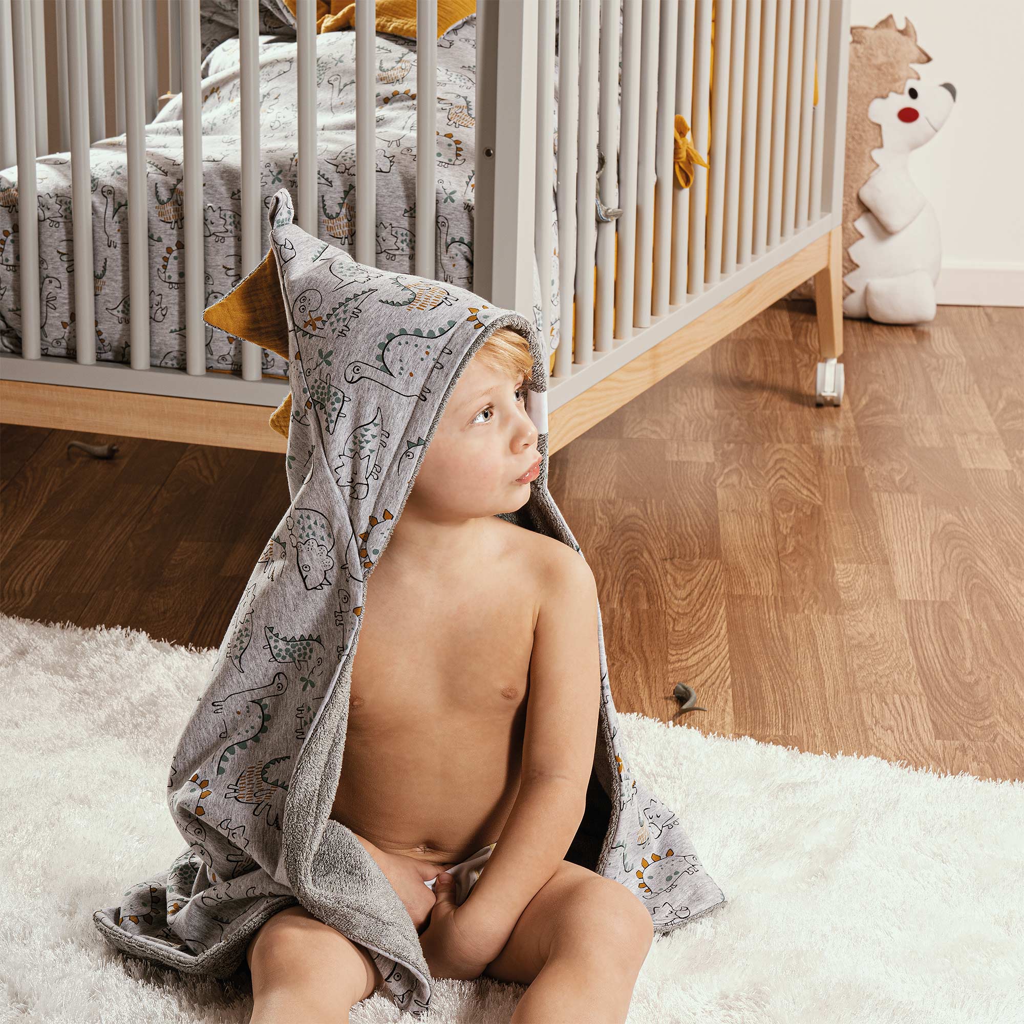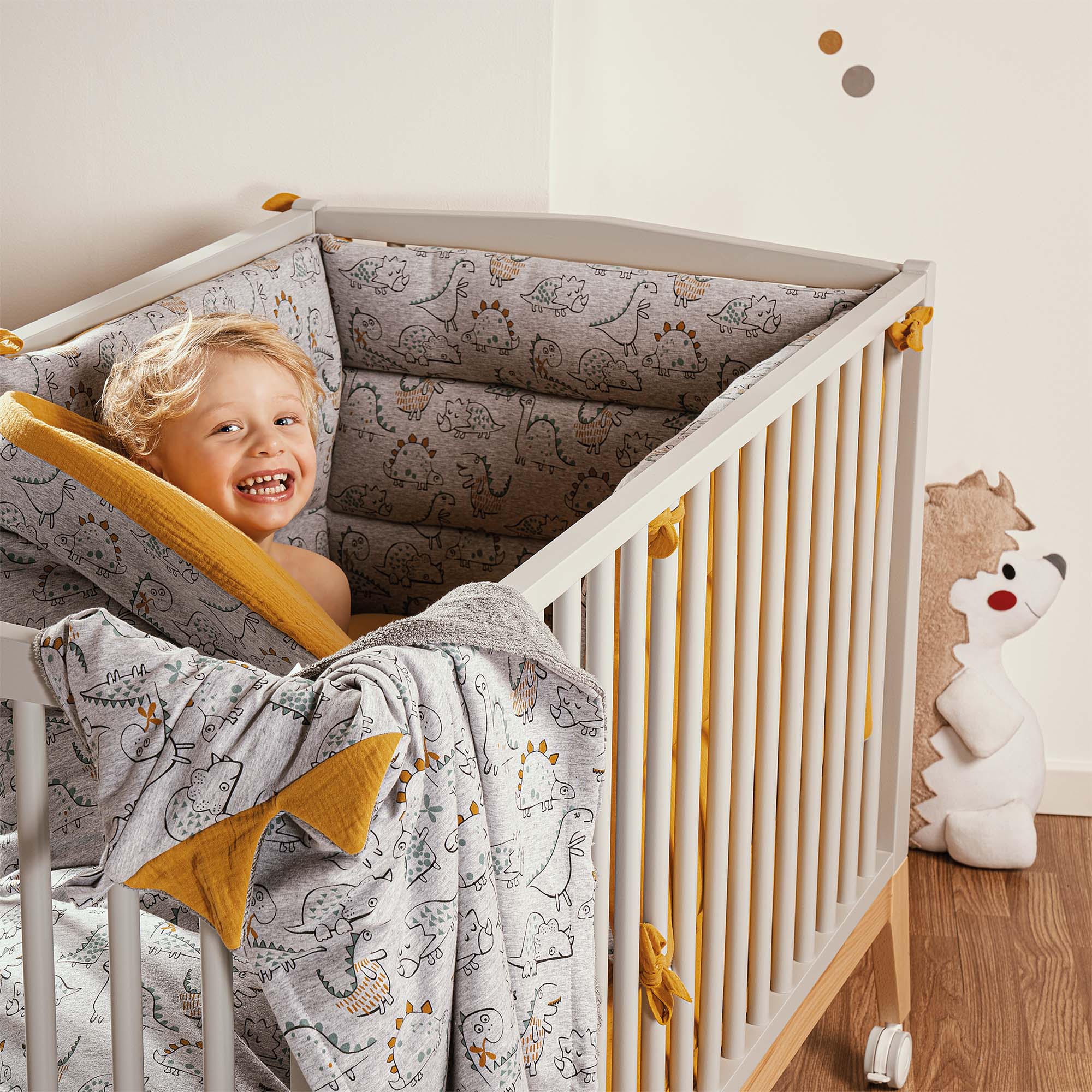 Wesentliche Linien, vielseitige Möbel und Jerseystoffe aus reiner Baumwolle. Die Farben reichen von verschiedenen Grautönen bis hin zu Senfgelb und Weiß, begleitet von einem entzückenden Dinosauriermotiv, und passen problemlos in die Zimmerdekoration von Mama und Papa.