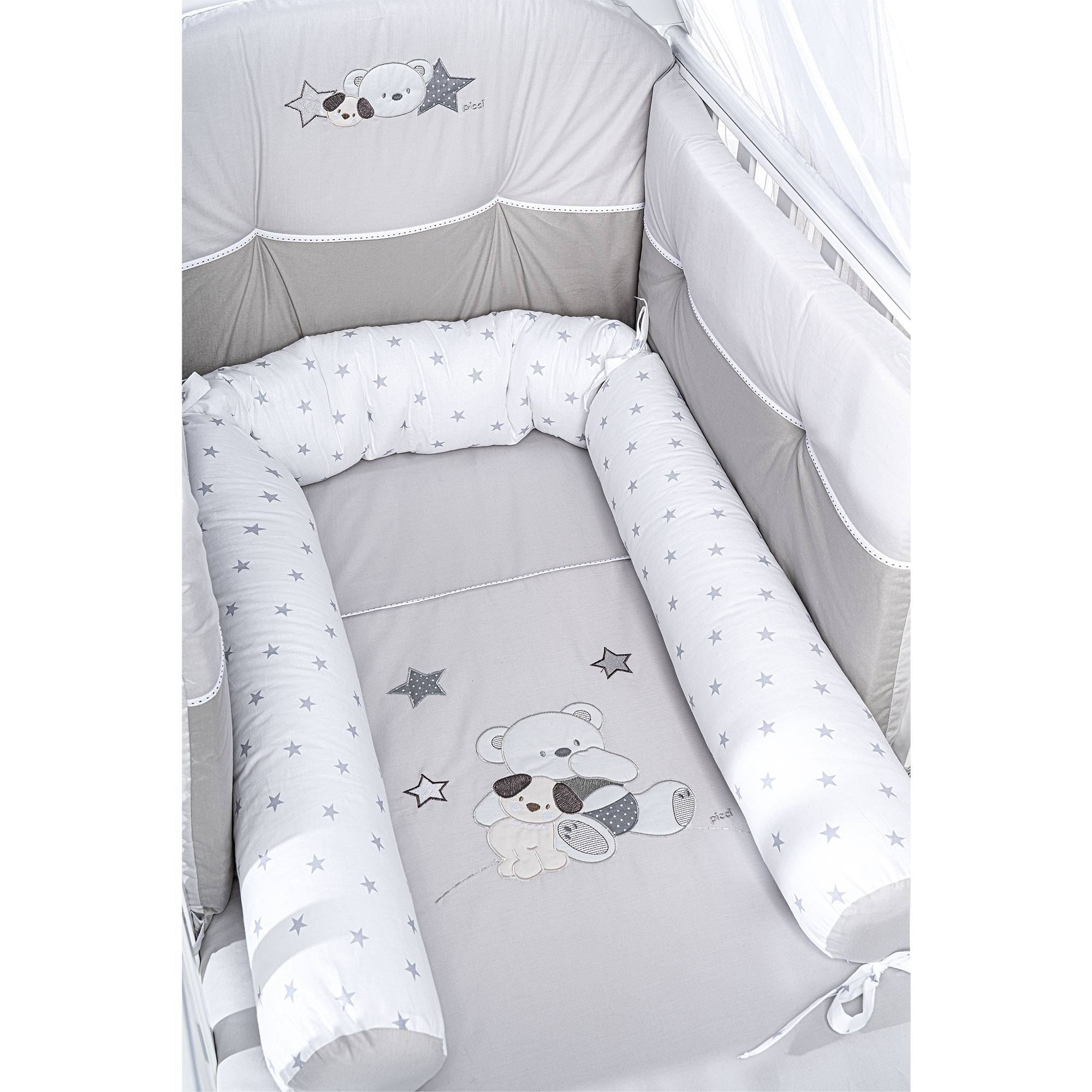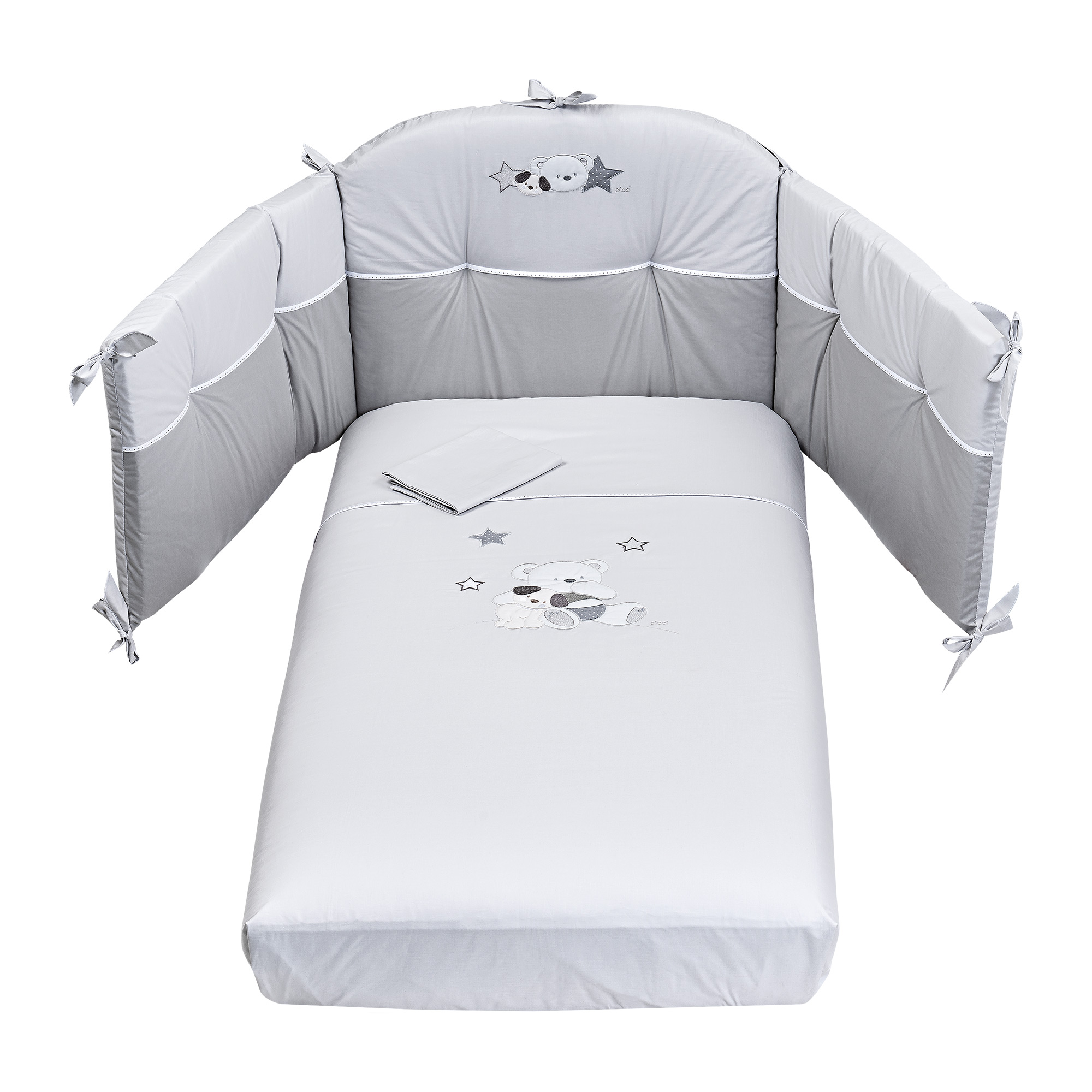 Die Kollektion bietet ein Set für das Kinderbett komplett mit Kissenbezug, Bettdecke und Bettstoßstange. Das Set beinhaltet den passenden Bettstoßstange, der ein unverzichtbares Accessoire zum Schutz Ihres Kindes ist und dank romantischer Schleifen einfach am Bettgitter befestigt werden kann. Die Bettdecke mit weicher Füllung und hochwertiger Baumwolle gibt Ihrem Kind ein angenehmes und beruhigendes Gefühl.
