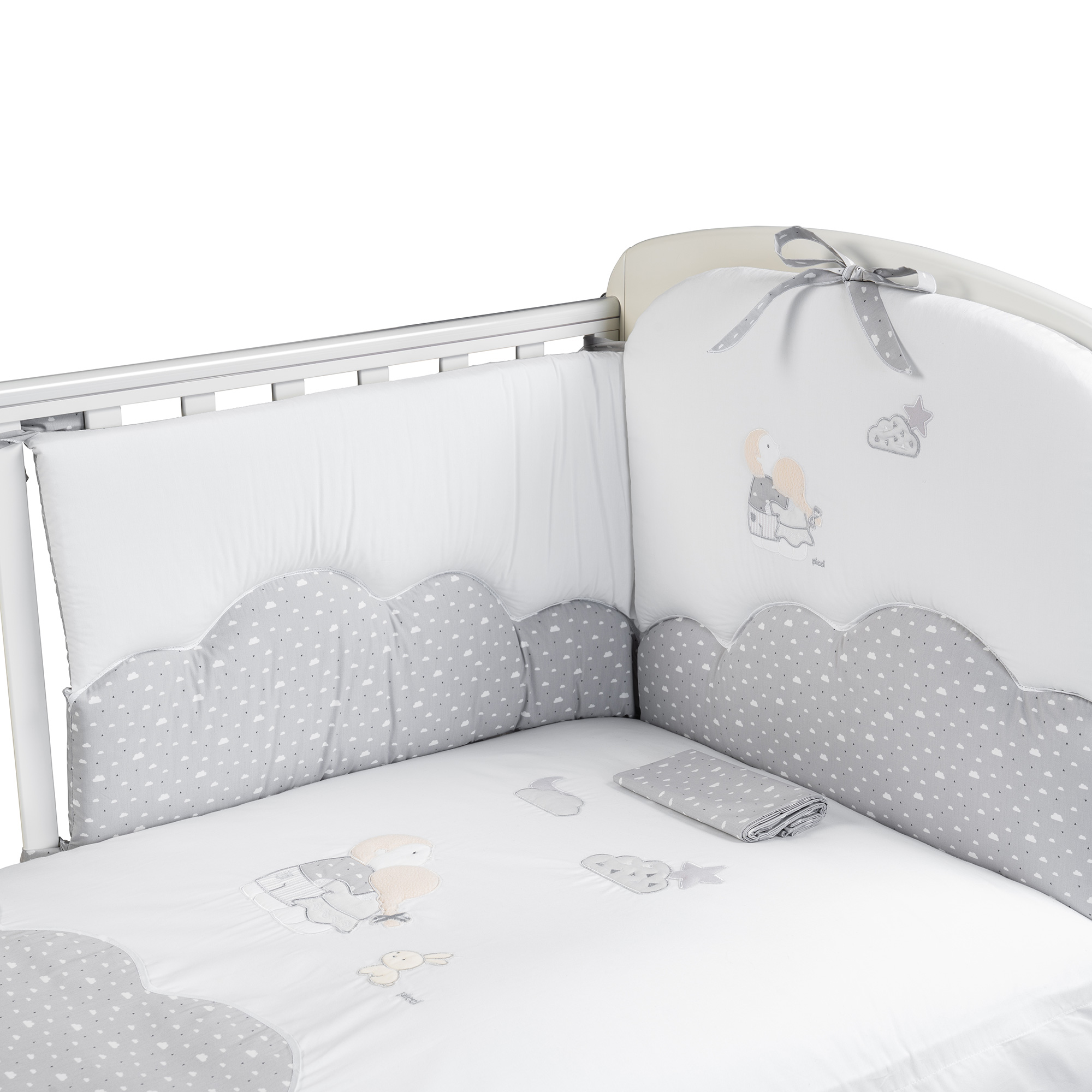 Die Kollektion bietet ein Set für das Kinderbett komplett mit Kissenbezug, Bettdecke und Bettstoßstange. Das Set beinhaltet den passenden Bettstoßstange, der ein unverzichtbares Accessoire zum Schutz Ihres Kindes ist und dank romantischer Schleifen einfach am Bettgitter befestigt werden kann. Die Bettdecke mit weicher Füllung und hochwertiger Baumwolle gibt Ihrem Kind ein angenehmes und beruhigendes Gefühl.