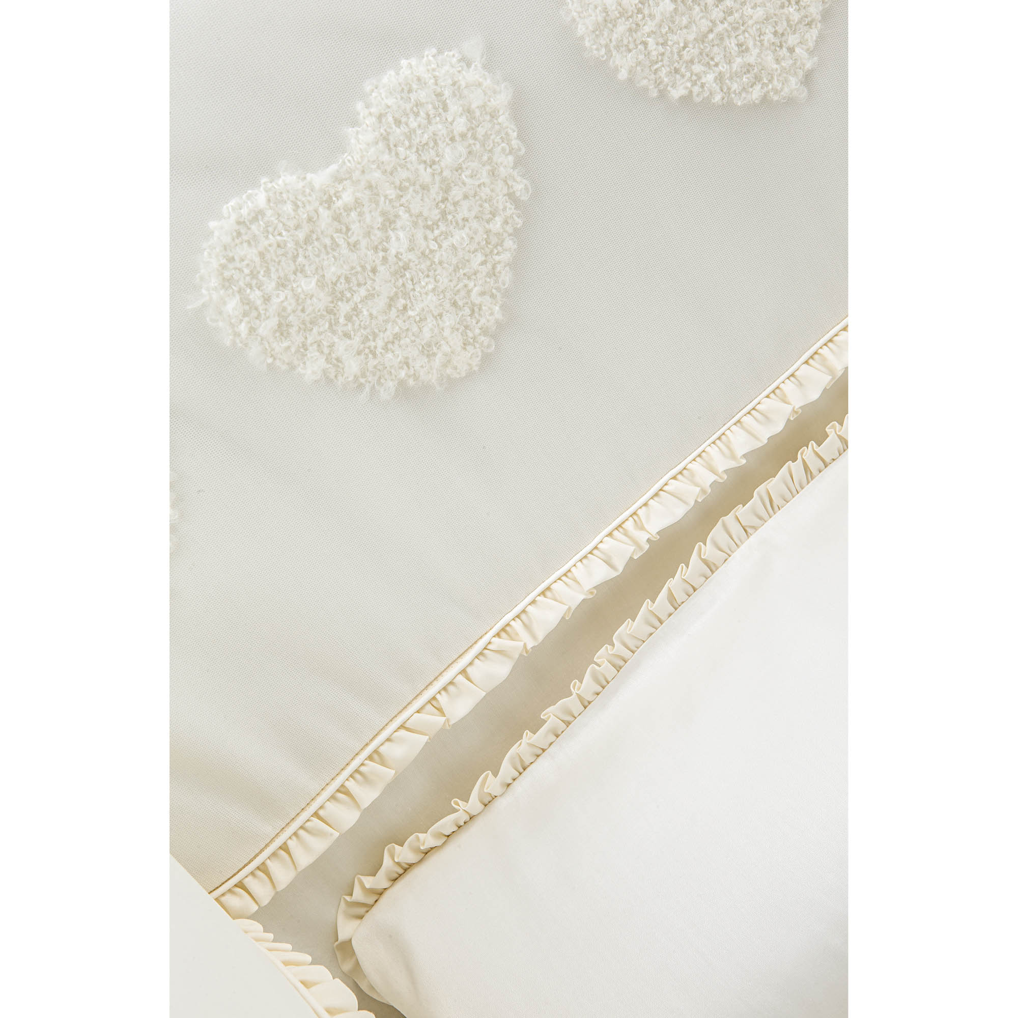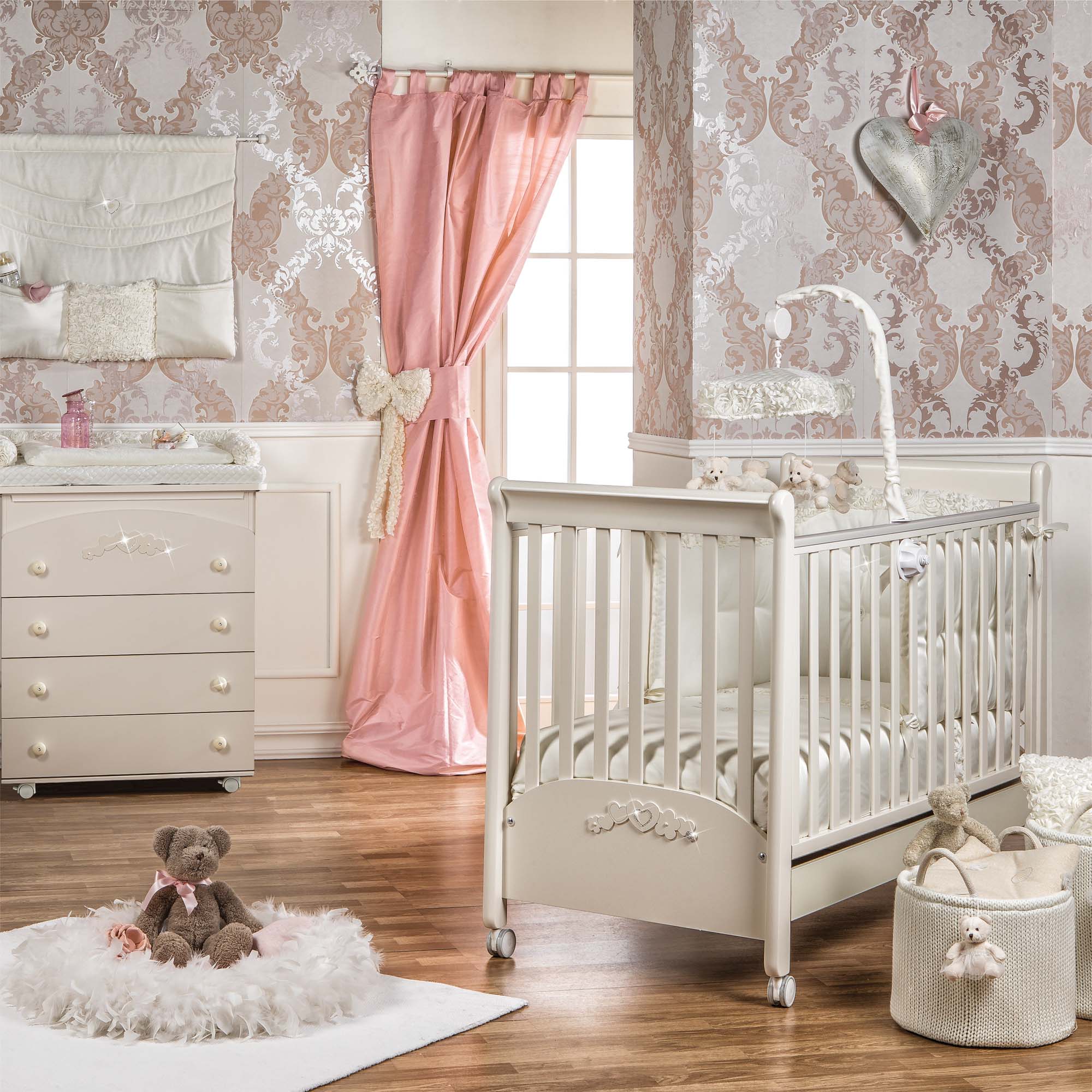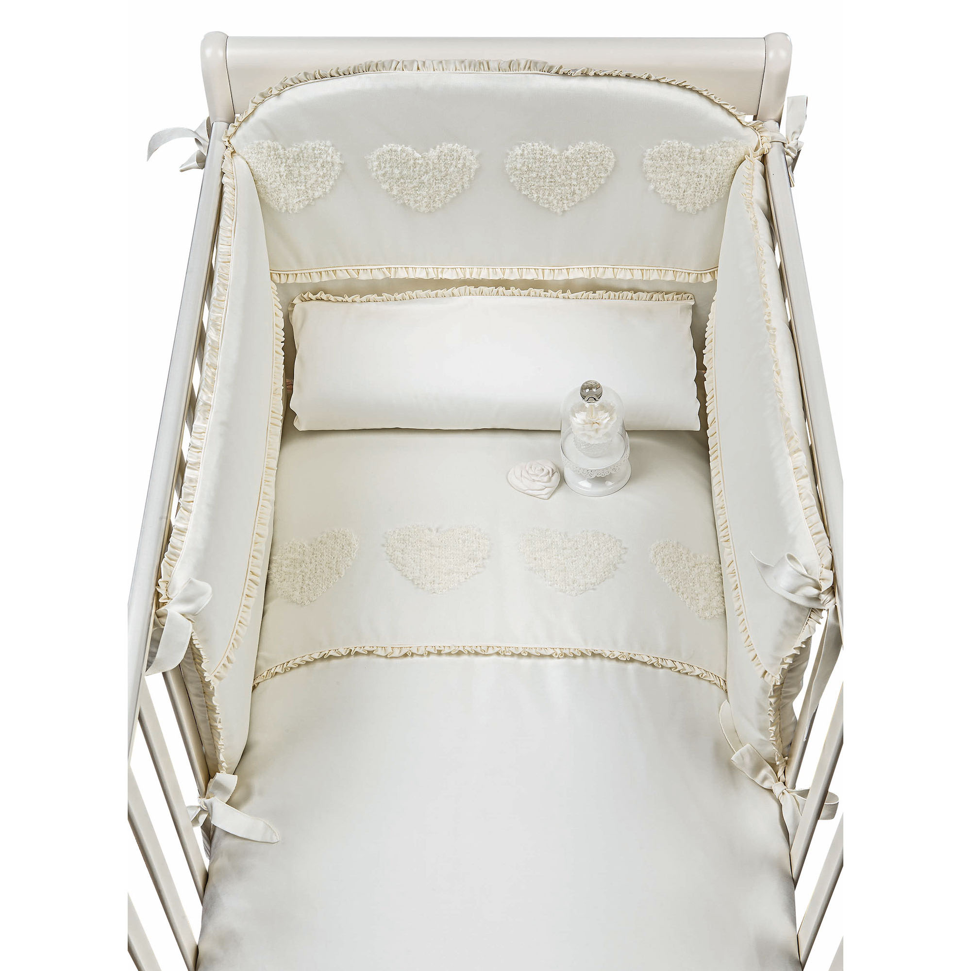 Die Kollektion bietet ein Set für das Kinderbett komplett mit Kissenbezug, Bettdecke, Bettstoßstange und Matratzenbezug. Das Set beinhaltet den passenden Bettstoßstange, der ein unverzichtbares Accessoire zum Schutz Ihres Kindes ist und dank romantischer Schleifen einfach am Bettgitter befestigt werden kann. Die Bettdecke mit weicher Füllung und hochwertiger Baumwolle gibt Ihrem Kind ein angenehmes und beruhigendes Gefühl.