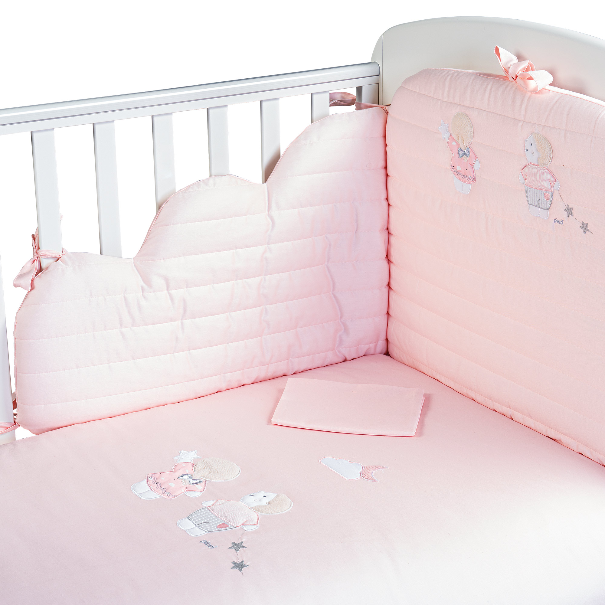 Die Kollektion bietet ein Set für das Kinderbett komplett mit Kissenbezug, Bettdecke und Bettstoßstange. Das Set beinhaltet den passenden Bettstoßstange, der ein unverzichtbares Accessoire zum Schutz Ihres Kindes ist und dank romantischer Schleifen einfach am Bettgitter befestigt werden kann. Die Bettdecke mit weicher Füllung und hochwertiger Baumwolle gibt Ihrem Kind ein angenehmes und beruhigendes Gefühl.