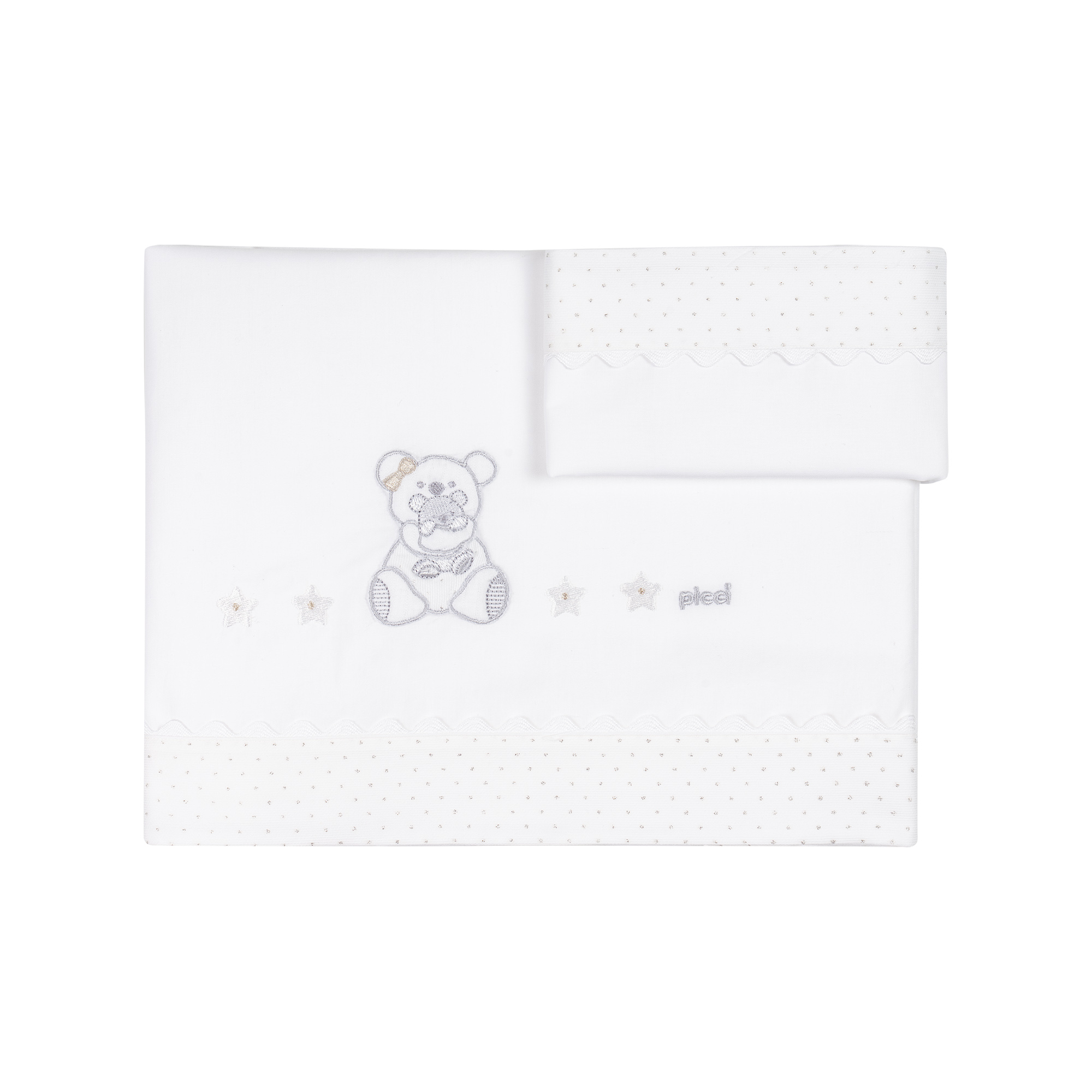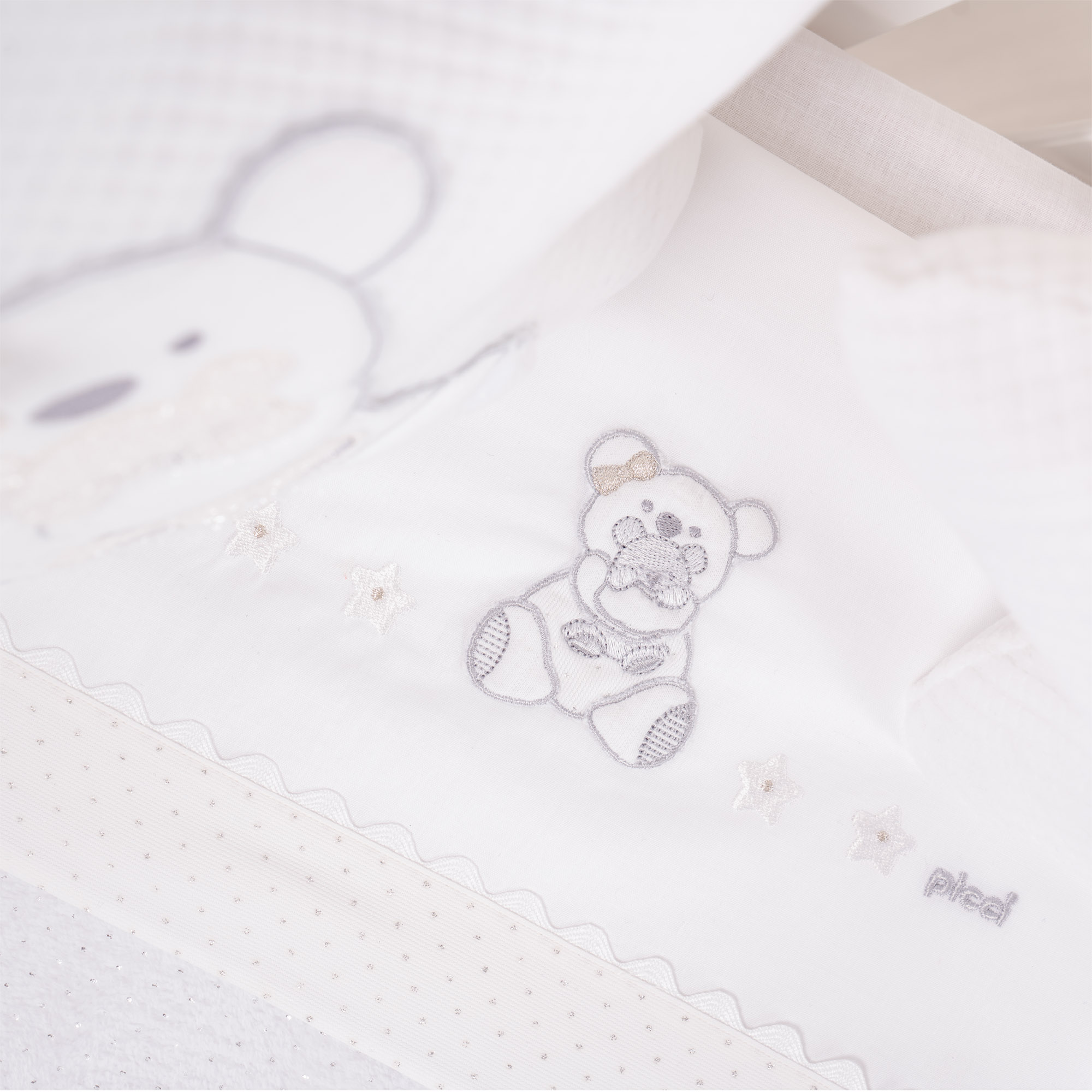 Dieses Bettlaken-Set ist für ein Kinderbett mit Gitterstäben in Standardgröße geeignet. Dieses Bettwäscheset besteht aus reiner Baumwolle und ist mit zarten Stickereien zum Thema der Kollektion versehen. Es besteht aus einem Kissenbezug, einem Laken und einem passenden Spannbettlaken. Eine perfekte Geschenkidee, um jedem Kinderzimmer eine besondere Note zu verleihen.