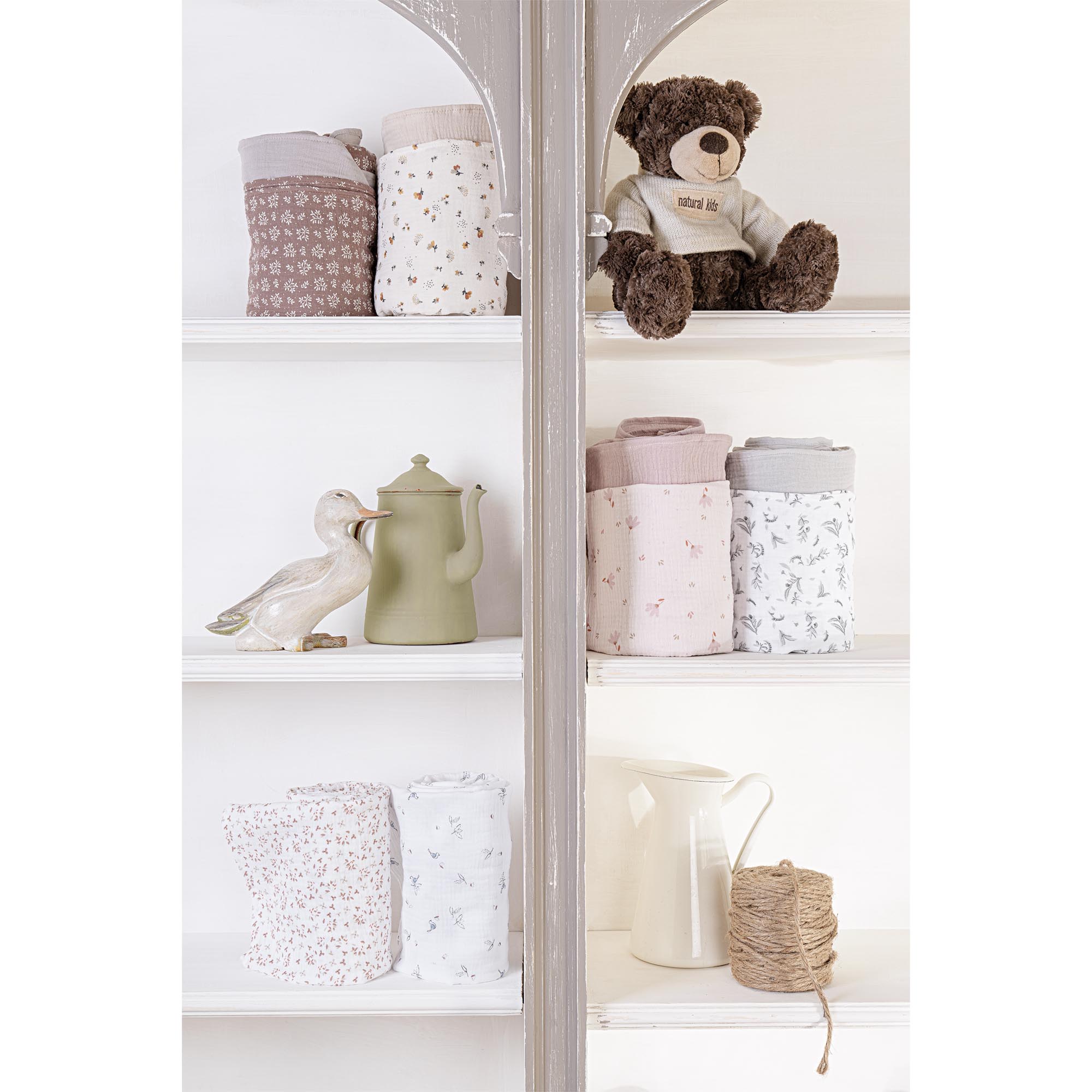 Das Set besteht aus 2 swaddle aus Bio-Baumwoll-Musselin: einem gemusterten und einem unifarbenen Teil.