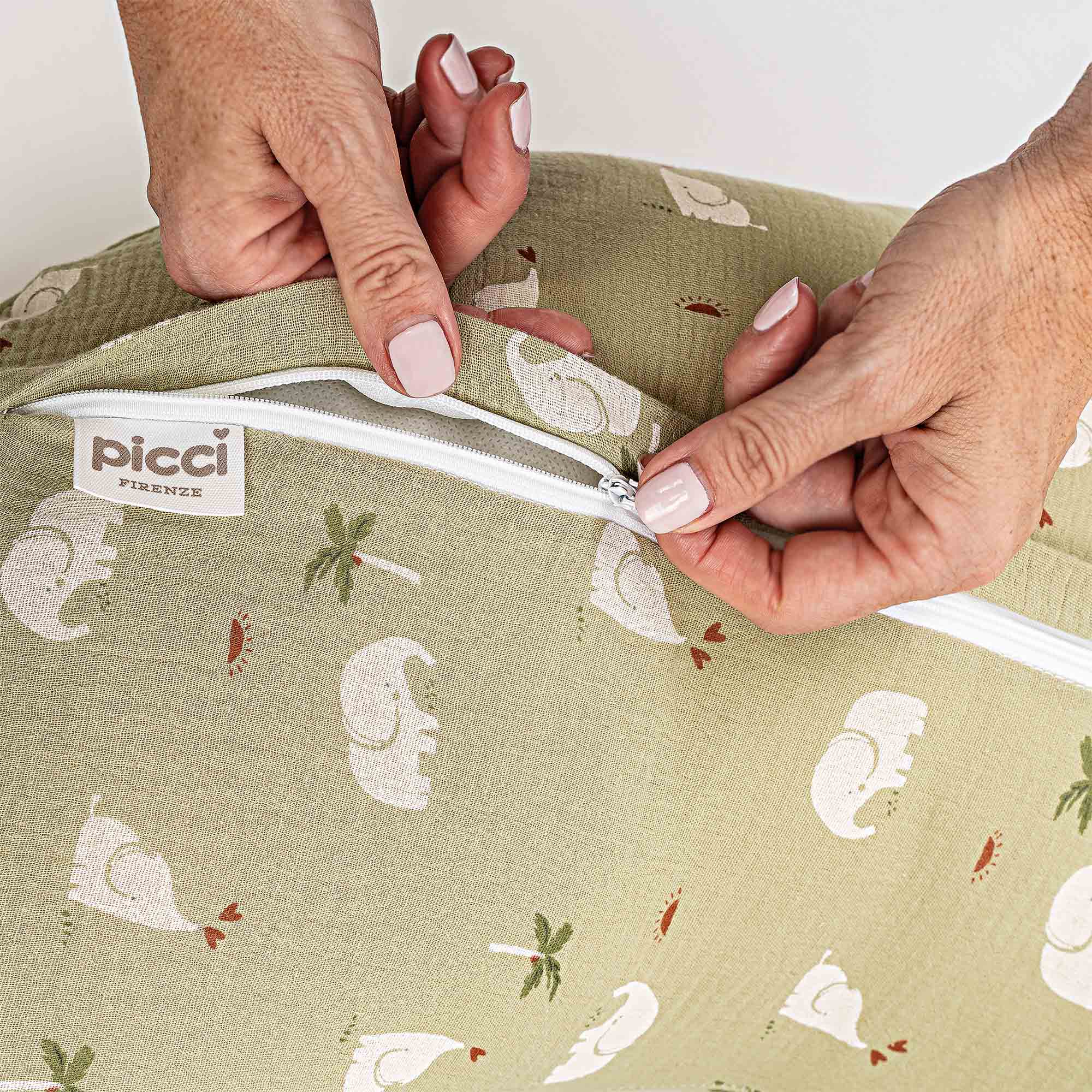 Das Stillkissen ist ein unverzichtbares Hilfsmittel, das jungen Müttern die Arbeit erleichtert. Entwickelt, um das Gewicht des Babys während des Stillens zu tragen, garantiert es sowohl der Mutter als auch dem Baby die korrekteste und bequemste Position. Außenbezug aus 100 % Baumwolle. Dank der weichen Innenpolsterung ist er ein hervorragender Verbündeter, der eine gute Verdauung des Babys ermöglicht, das unmittelbar nach dem Füttern darin gelegt werden kann, um seinen Rücken in einer aufrechten Position zu halten und das Risiko zu verringern von Reflux und Aufstoßen. Abnehmbar.