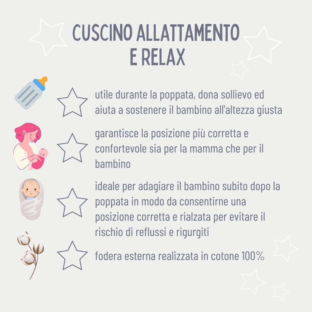 Das Stillkissen ist ein unverzichtbares Hilfsmittel, das jungen Müttern die Arbeit erleichtert. Entwickelt, um das Gewicht des Babys während des Stillens zu tragen, garantiert es sowohl der Mutter als auch dem Baby die korrekteste und bequemste Position. Außenbezug aus 100 % Baumwolle. Dank der weichen Innenpolsterung ist er ein hervorragender Verbündeter, der eine gute Verdauung des Babys ermöglicht, das unmittelbar nach dem Füttern darin gelegt werden kann, um seinen Rücken in einer aufrechten Position zu halten und das Risiko zu verringern von Reflux und Aufstoßen.