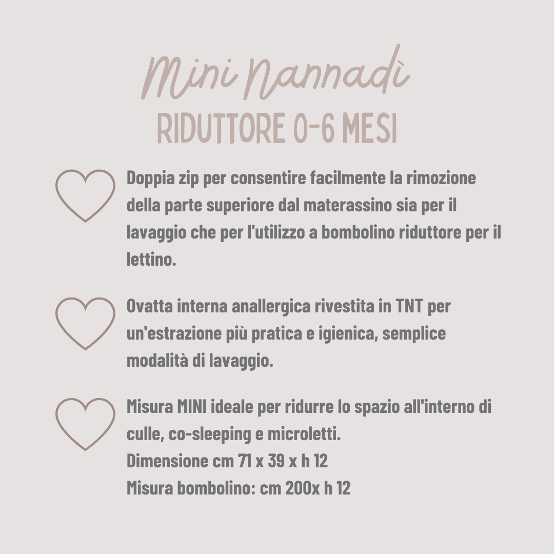 Doppelter Reißverschluss zum einfachen Abnehmen des Oberteils von der Matratze, sowohl zum Waschen als auch zur Verwendung mit einem Reduzierbehälter. Interne hypoallergene Watte mit TNT-Beschichtung für eine praktischere und hygienischere Extraktion, einfache Waschmethode, die auch durch die Extraktionsfähigkeit begünstigt wird. Weicher Schutz, der für Ihr Baby in den ersten Lebensmonaten notwendig ist, mit der Abgrenzung einer kleinen Schlafumgebung.