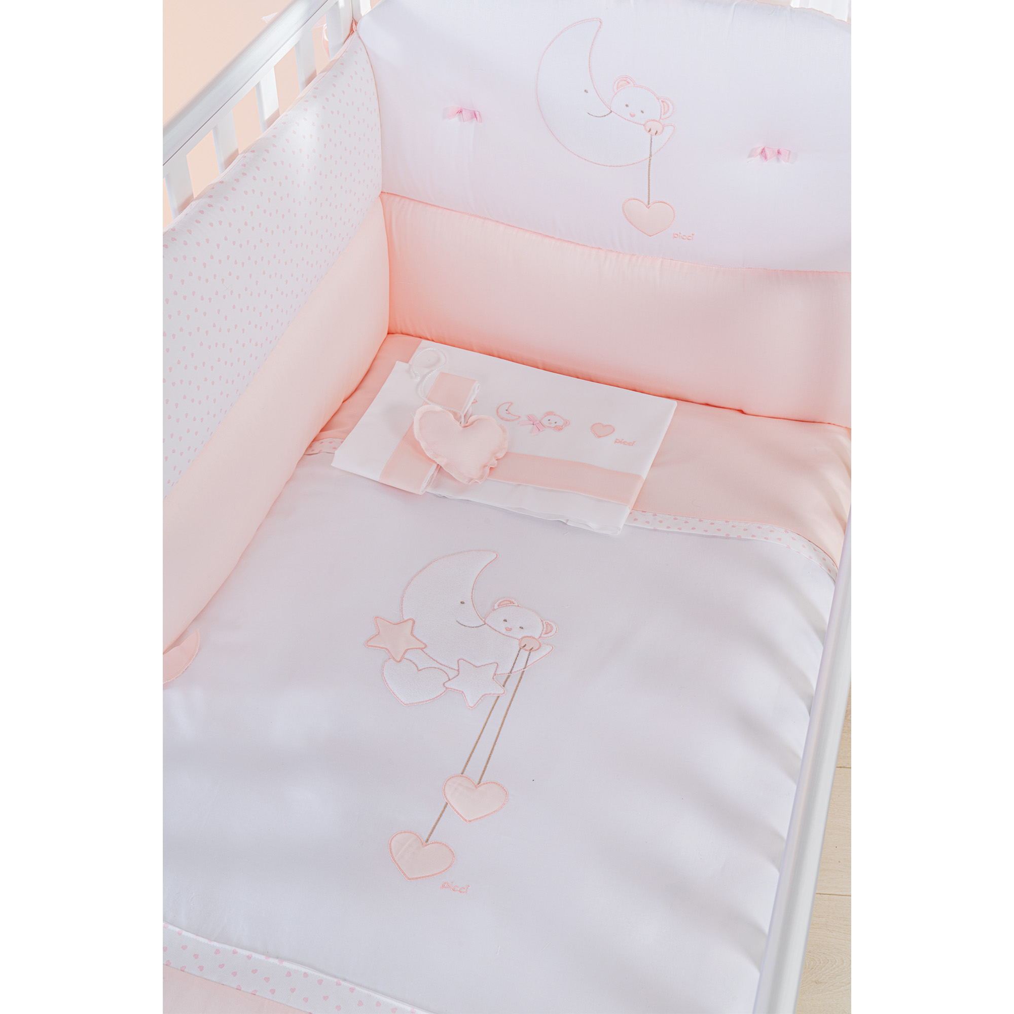 Questo corredo di lenzuolini รจ adatto ad un lettino con le sbarre di misure standard. Realizzato con un candido cotone e teneri ricami in tema con la collezione, questo set di biancheria comprende una federa, un lenzuolo e un coprimaterasso con angoli. Un’idea regalo perfetta per donare un tocco speciale a qualsiasi nursery.